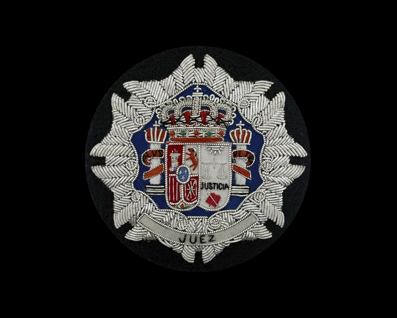 Emblema bordado a mano con hilo plateado de Juez. Tamaño: 85 mm de diámetro. Doble imperdible trasero. Puede encontrar más artículos relacionados pinchando aquí.